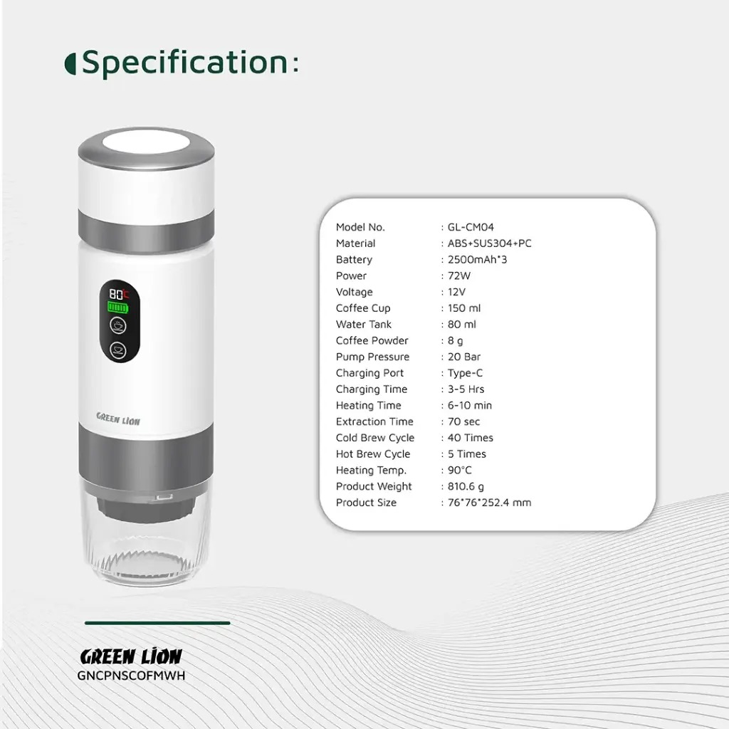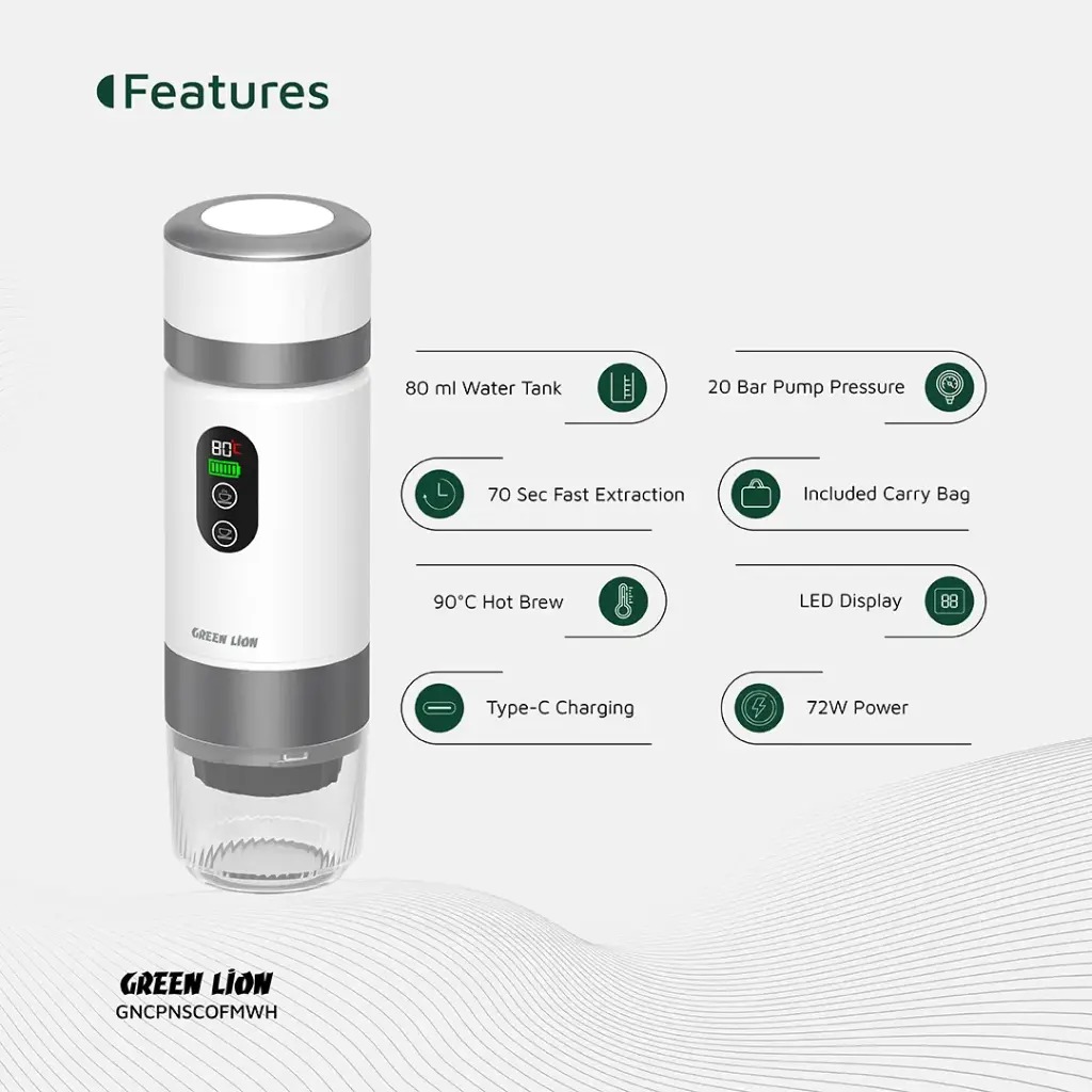 با قهوهساز قابل حمل Green Lion Campinas، در هر مکان و هر زمان از عطر و طعم واقعی اسپرسو لذت ببرید.