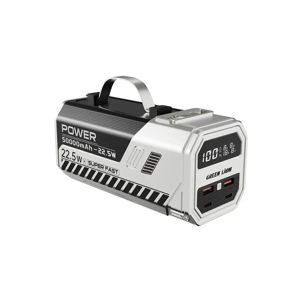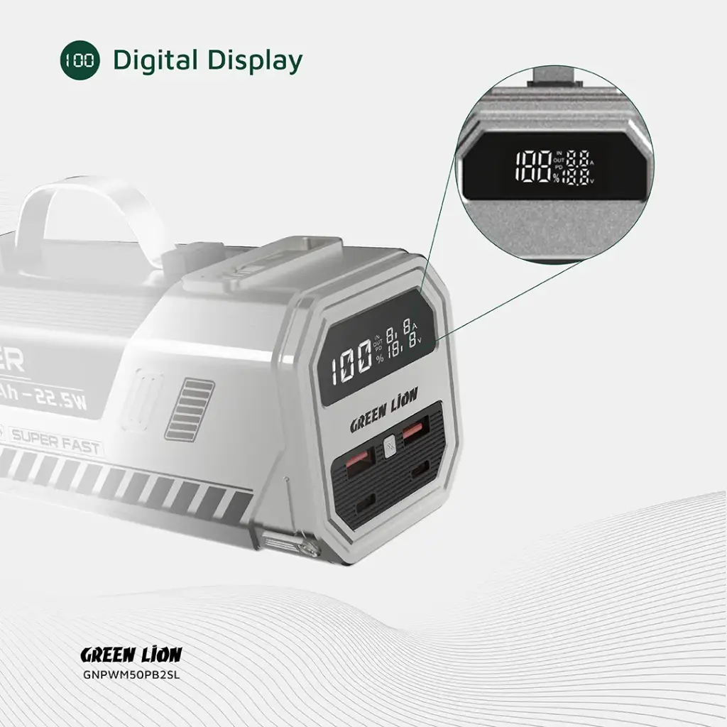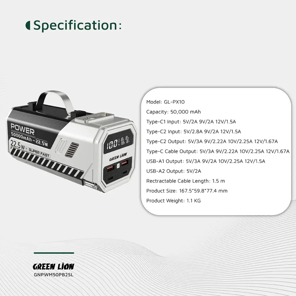 Green Lion Power Max 50000mAh Power Bank 22.5W (مدل GNPWM50PB2SL یا مشابه) یکی از قدرتمندترین و کاربردیترین پاوربانکهای شرکت Green Lion است که با ظرفیت فوقالعاده بالا ۵۰,۰۰۰ میلیآمپرساعت، طراحی شده تا نیازهای شارژ سنگین کاربران را برآورده کند.