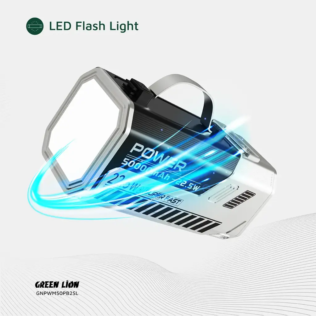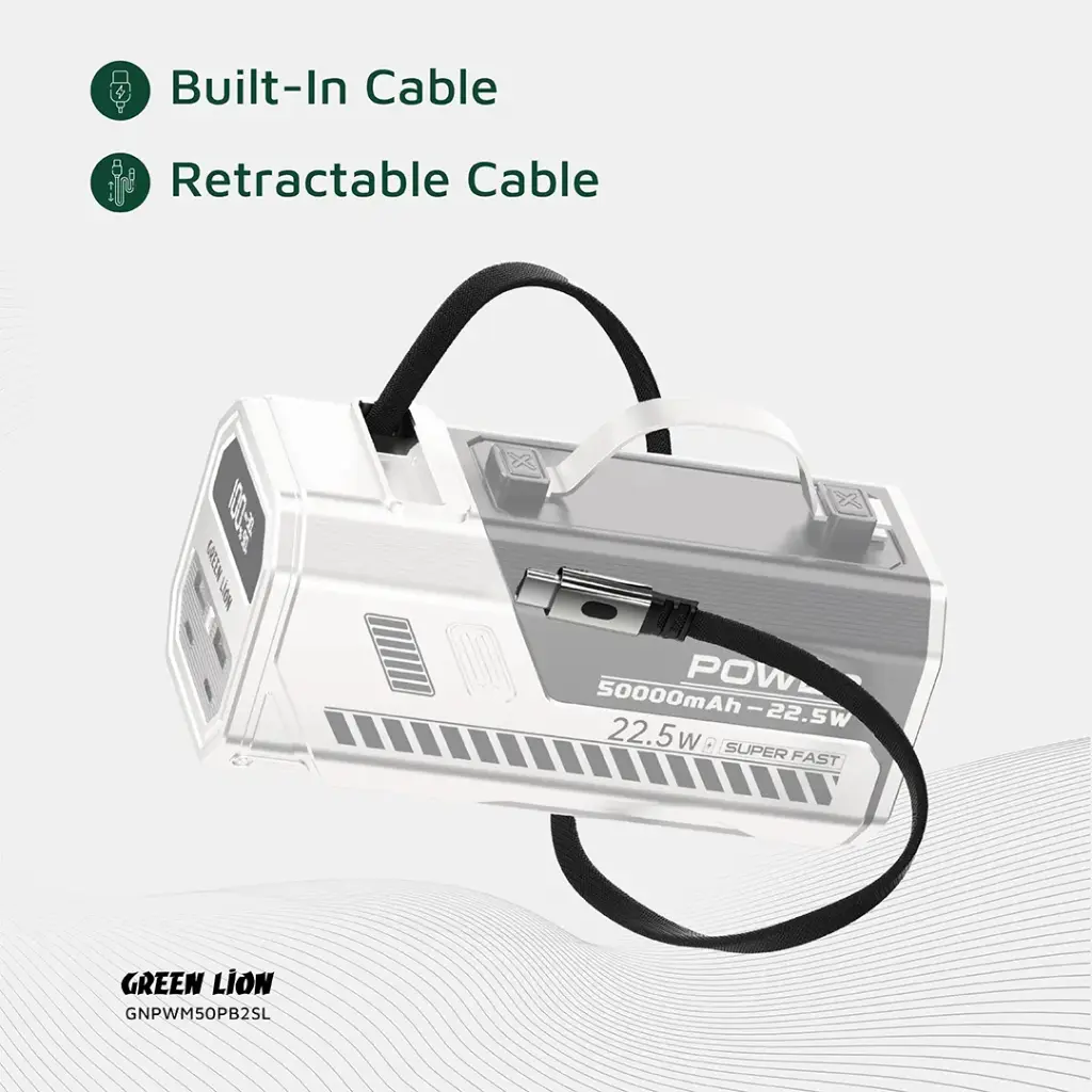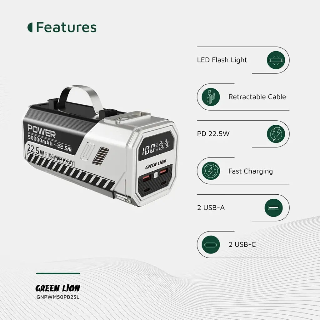 Green Lion Power Max 50000mAh Power Bank 22.5W (مدل GNPWM50PB2SL یا مشابه) یکی از قدرتمندترین و کاربردیترین پاوربانکهای شرکت Green Lion است که با ظرفیت فوقالعاده بالا ۵۰,۰۰۰ میلیآمپرساعت، طراحی شده تا نیازهای شارژ سنگین کاربران را برآورده کند.