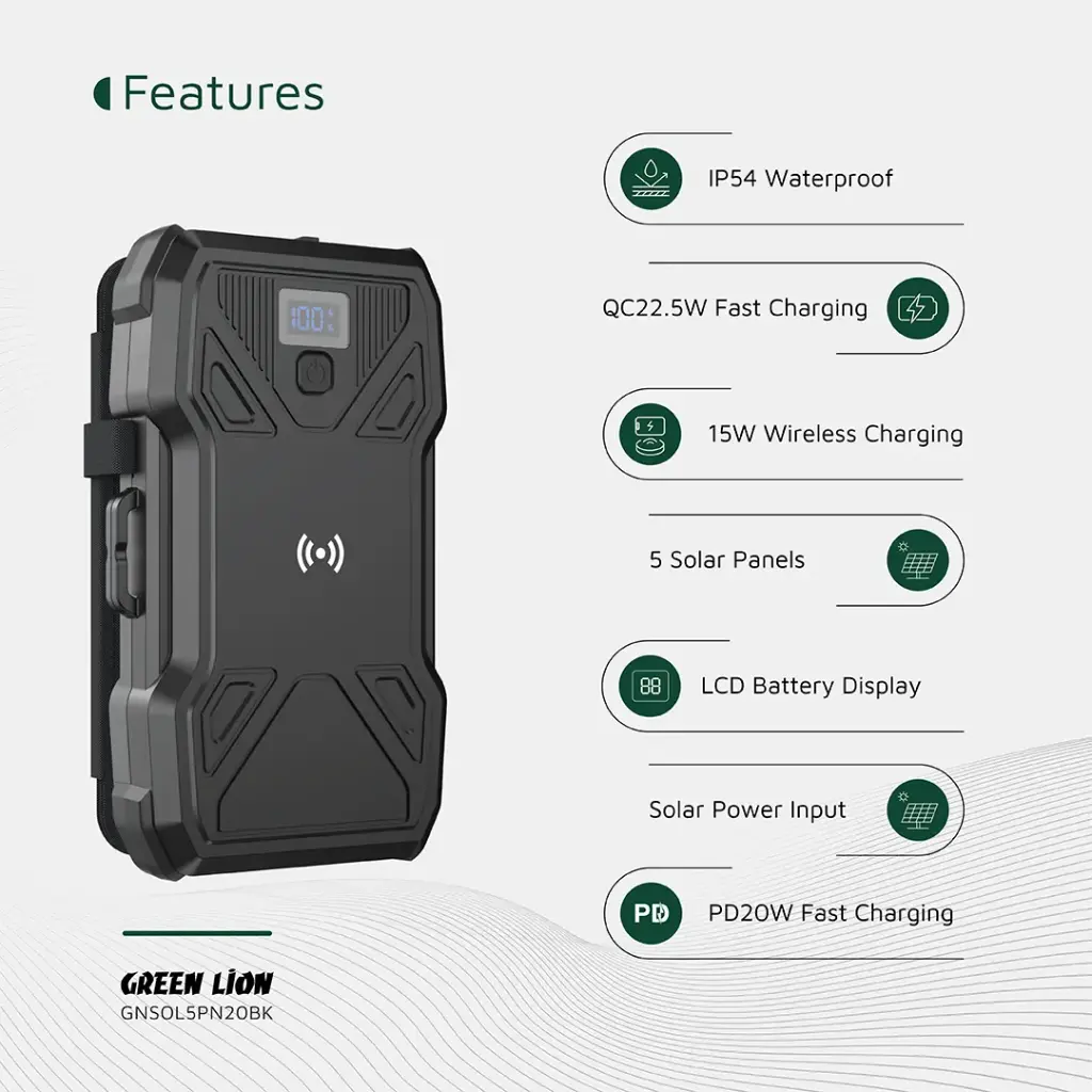 پاور بانک خورشیدی گرین لاین Green Lion Solar 5-Panel 20000mAh Power Bank PD20W یک انتخاب هوشمندانه برای افرادی است که همیشه به منبع انرژی مطمئن نیاز دارند. طراحی مقاوم و بدنه ساختهشده از ABS + PC باعث شده این پاوربانک در شرایط مختلف دوام بالایی داشته باشد و برای استفاده در فضای باز کاملاً مناسب باشد.